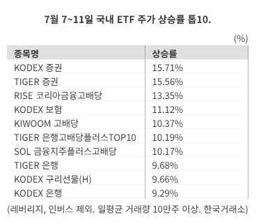 According to the Korea Exchange on the 13th, the product that recorded the highest return in the ETF market from the 7th to the 11th was 'KODEX Securities', which rose by 15.71%. It was followed by 'TIGER Securities (15.56%)', 'RISE Korea Financial High Dividend (13.35%)', and 'KODEX Insurance (11.12%)' in the top ranks. Leverage, inverse items, and items with an average daily trading volume of less than 100,000 shares were excluded from the tally.