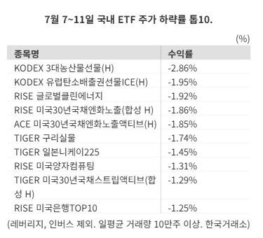 On the other hand, agricultural ETFs and European carbon emission ETFs showed a downward trend. 'KODEX 3 Major Agricultural Futures (-2.86%)', 'KODEX European Carbon Emission Rights Futures ICE (-1.95%)', and 'RISE Global Clean Energy (-1.86%)' formed the top ranks in decline rates.