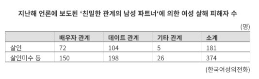 According to the Korea Women's Hotline on the 5th, last year, at least 181 women were killed by men in intimate relationships such as husbands or boyfriends, and 374 women survived attempted murder, totaling 555 female victims of relationship crimes in one year. However, these figures are based on media reports compiled by the Korea Women's Hotline due to the absence of official statistics, and the actual number of victims is expected to be much higher when including unreported cases.