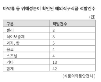 The Ministry of Food and Drug Safety conducted a planned inspection of 50 overseas direct purchase foods suspected of containing drug ingredients such as cannabis and announced on the 2nd that drug ingredients or raw materials and ingredients subject to import blocking were confirmed in 42 products, leading to the blocking of their import.