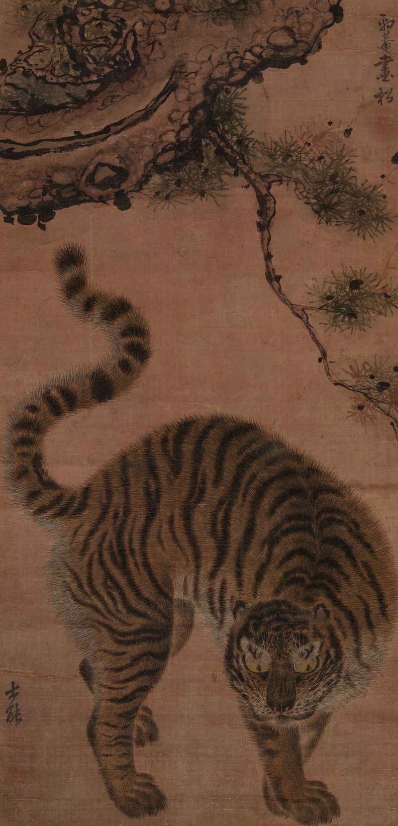 'Songhamaenghodo' by Kim Hongdo (1745–1806, presumed), a master of late Joseon dynasty painting, is also on display. This work, completed in Kim’s distinctive realistic style, is a classic painting. The posture of the tiger turning its body beneath a pine tree closely resembles the 'Tiger Descending the Mountain' motif, the prototype for folk art Magpie and Tiger paintings.