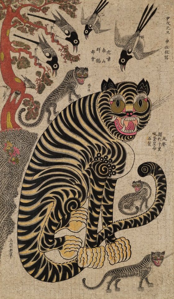 A 'Hojak-do' believed to have been painted by Shin Jae-hyeon in 1874 is a rare example where both the artist and date are known. The painting includes an inscription describing the tiger’s dignity and majesty, such as, "As the tiger roars, flocks of magpies gather." This work uniquely combines the characteristics of folk art with those of literati painting.