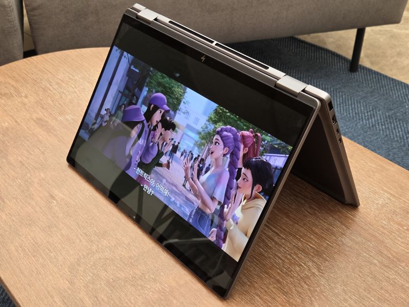 The HP OmniBook X Flip 14 is a laptop that can also function as a tablet. Its 14-inch touch display folds all the way back, allowing it to be used in tablet mode. You can also prop it up in a tent shape, which makes watching videos more convenient. The left side features USB Type-A, HDMI 2.1, Thunderbolt 4, and USB 3.2 ports, while the right side includes headphone/microphone jacks and another USB Type-A port. The device measures 31.3 x 21.85 x 1.46 cm and weighs 1.39 kg.