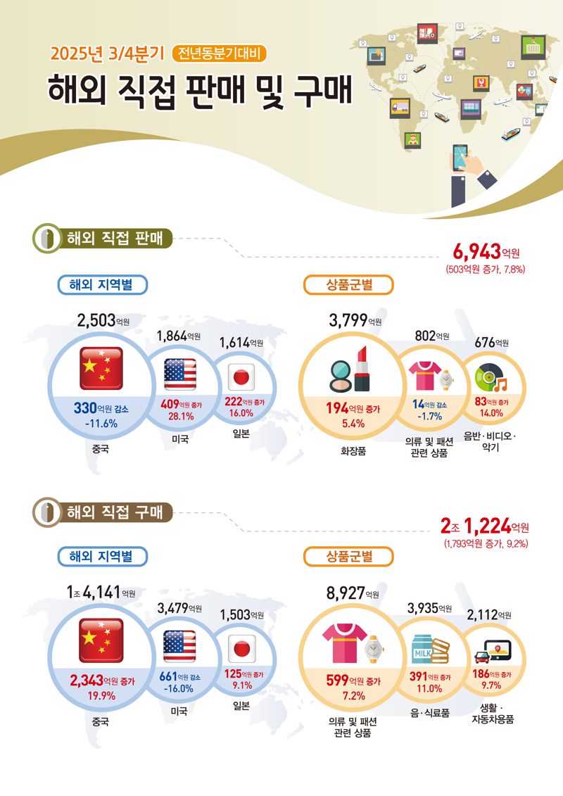 On the other hand, overseas direct sales in the third quarter reached 694.3 billion won, up 7.8% from the same period last year. By region, online overseas direct sales amounted to 250.3 billion won for China, 186.4 billion won for the US, and 161.4 billion won for Japan. Compared to the same period last year, sales to China decreased by 11.6%, while sales to the US (up 28.1%), Japan (up 16.0%), and ASEAN (up 16.4%) increased. Compared to the previous quarter, sales to the US increased by 4.1%, while sales to China (down 29.1%) and Japan (down 8.0%) decreased. Duty-free sales amounted to 173.3 billion won for China, 12.8 billion won for ASEAN, and 4.4 billion won for Japan.