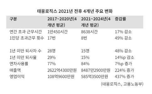 Kim Seung-kyu, head of the HR team at Taewoong Logistics, stated, “The 2020 workplace innovation consulting by the Korea Labor Foundation was a turning point for us to continuously improve productivity and reduce working hours. These efforts led to lower resignation rates and increased sales and operating profit.” Since 2022, Taewoong Logistics has also received support from the Ministry of Employment and Labor (MOEL) for building work-life balance infrastructure.