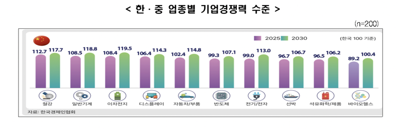 ■ In Five Years, Semiconductors and Shipbuilding Will Also Be OvertakenCurrently, Korea is still considered more competitive than China in five sectors: semiconductors (99.3), electrical and electronics (99.0), ships (96.7), petrochemicals and petroleum products (96.5), and biohealth (89.2). However, by 2030, China is expected to surpass Korea in all 10 major industries.