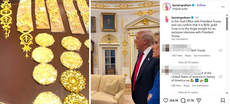 Anchor Ingraham also posted the interview video on her Instagram and other social media accounts, writing, "Confirmed it's REAL gold in the Oval Office," lending support to Trump's explanation.