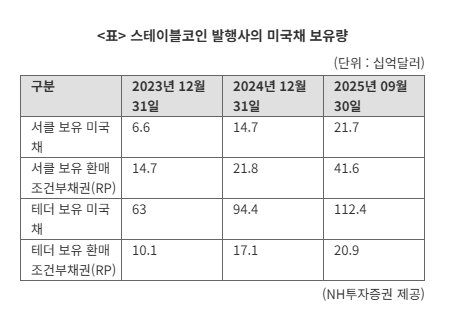 U.S. Treasury Bond Holdings by Stablecoin Issuers [Financial News] The total issuance of U.S. dollar-pegged Stablecoins has exceeded $300 billion (KRW 437 trillion). This marks an increase of nearly 80% compared to the same period last year. With the Trump administration’s favorable regulatory environment and the potential for use as an AI payment method, many analysts expect the market to grow to $2 trillion by 2030. According to the '2026 Digital Asset Outlook' report published by NH Investment & Securities on the 17th, the total Stablecoin issuance at the end of last month reached $300 billion, up 78% year-on-year. As Stablecoin issuance rises, the short-term U.S. Treasury holdings of issuing companies are also increasing rapidly. USD Coin (USDC) and Tether (USDT), two global Stablecoin issuers, currently hold $21.7 billion and $112.4 billion in U.S. Treasuries, respectively. Including repurchase agreement (RP) holdings, the two companies’ total investment in U.S. short-term bonds approaches $200 billion. Hong Sung-wook, a researcher at NH Investment & Securities, stated, “The phase of large-scale Stablecoin issuance is likely to continue for the time being,” adding, “By the end of 2030, the market could reach around $2 trillion.” KB Securities also highlighted the U.S. government’s aggressive forecasts, noting that these figures reflect a strong commitment to fostering Stablecoins. Kim Ji-won, a researcher at KB Securities, explained, “The U.S. Department of the Treasury (Treasury Department) projects that the Stablecoin market will grow to about $2 trillion by 2028.” Kim added, “Citigroup Inc. has presented a bullish scenario, estimating the market could expand from $1.9 trillion to as much as $4 trillion by 2030.” A key factor driving the growth of the Stablecoin market is the implementation timing of the U.S. Stablecoin law, the Guiding and Establishing National Innovation for U.S. Stablecoins Act (GENIUS Act). Passed last July, this law will allow a broader range of companies to issue Stablecoins once it takes effect next year. The GENIUS Act establishes requirements for Stablecoin issuers, reserve assets, and supervisory frameworks. Researcher Kim explained, “The GENIUS Act allows not only banks but also licensed non-bank institutions to issue Stablecoins. All issued Stablecoins must be fully backed by U.S. dollar cash, Treasuries, or Federal Reserve deposits.” Kim further noted, “For issuances exceeding $10 billion, federal regulation applies, while issuances below that threshold may choose state-level regulation, creating a dual regulatory framework.” With legal and institutional foundations in place, there are growing expectations that Stablecoins will generate synergies across various financial infrastructure sectors. Major areas of application include Financial Technology (FinTech), Real-World Asset Tokenization (RWA), and AI Agent payments. Researcher Hong stated, “While interest in Stablecoins themselves has been high, next year will see synergies with adjacent sectors as Stablecoins become part of financial infrastructure. We expect Stablecoin-based Neobanks to gain prominence as alternatives to traditional financial institutions.” A notable example is the 'x402' payment standard developed by Coinbase, which enables AI Agents to make automatic Stablecoin payments for paid content without human intervention. As a result, large-scale fundraising is ongoing, particularly in the payments and RWA sectors involving Stablecoins. According to an analysis by Korbit Research Center on institutional investor trends, crypto fund assets under management reached a record high of $230.5 billion in the third and fourth quarters of this year. Choi Yoon-young, head of Korbit Research Center, observed, “Major transactions in payments, AI, and RWA sectors are driving capital inflows. The future growth of the market will depend on the expansion of Stablecoin payments and competition in custody services.” [email protected] Kim Mi-hee Reporter