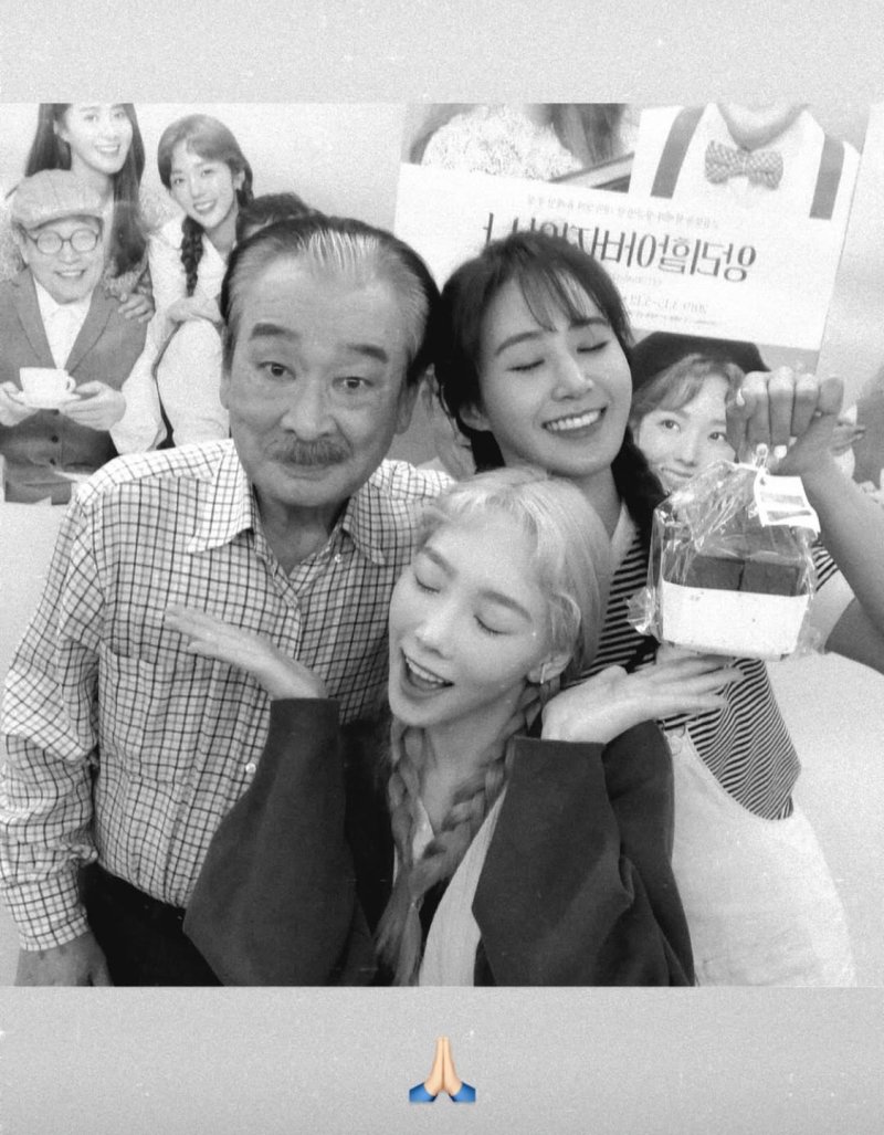 Taeyeon posted a praying hands emoji and a black-and-white photo on her social media. The photo features Taeyeon, fellow group member Kwon Yu-ri, and Lee Soon-jae posing together.