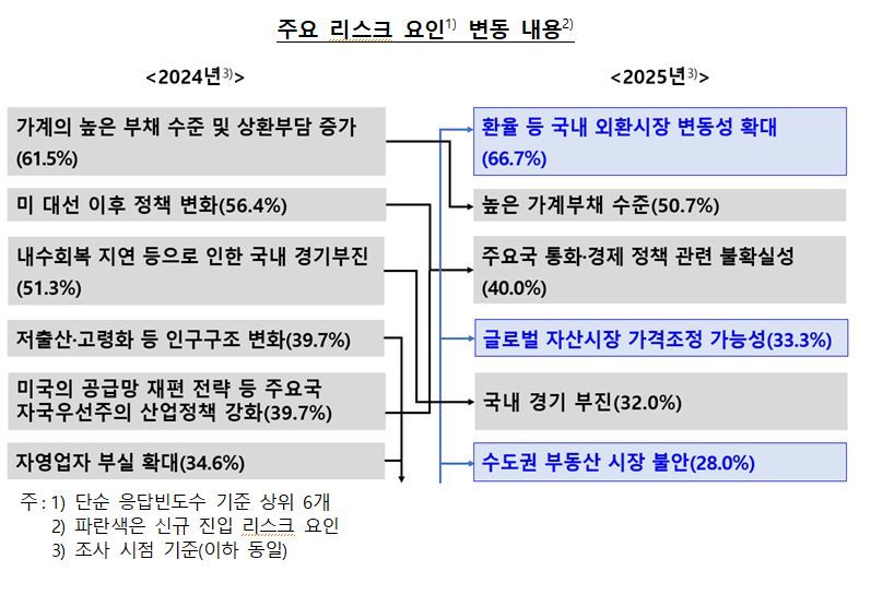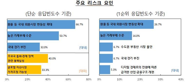 The widening volatility in the domestic foreign exchange market, including the exchange rate, the possibility of price corrections in global asset markets, and instability in the real estate market in the Seoul metropolitan area all entered the list as newly identified risk factors in this survey.