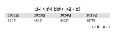 In fact, according to MOEL, 457 workers died in industrial accidents at worksites in the first three quarters of last year, a 3.2% increase from the previous year. This was the first increase since statistics began to be compiled in 2022. During the same period, deaths from industrial accidents in the construction industry and at workplaces with fewer than 50 employees rose by 3.4% and 10.4%, respectively, and the number of fatal accidents increased to 440 cases, up 7.1% year-on-year. The Serious Accidents Punishment Act has been fully enforced since January 27, 2022.