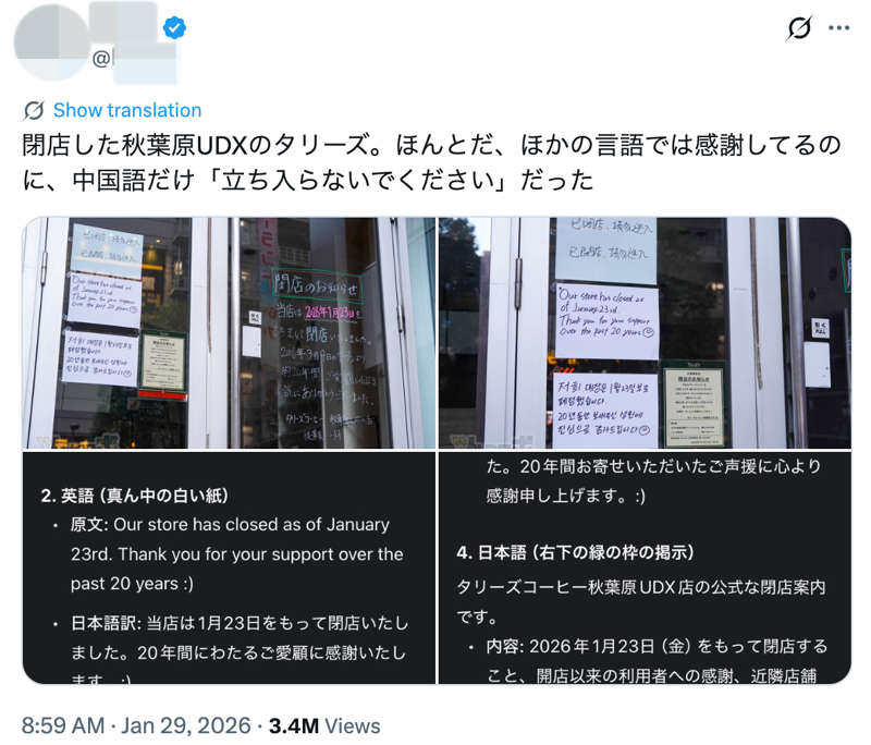As diplomatic tensions continue between China and Japan, a coffee shop in Tokyo has come under fire after announcing its closure in multiple languages. The controversy arose because only the Chinese version was seen as carrying a sense of hostility.