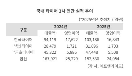 Including Kumho Tire, the combined sales of the three Korean tire makers are projected to reach 18.253 trillion won this year. That would be an 8.7% increase from 16.7921 trillion won a year earlier and the highest level on record. According to FnGuide, Kumho Tire, which is scheduled to announce its earnings on the 6th, is expected to post annual sales of 4.7448 trillion won for last year, up 4.7% from 4.5322 trillion won a year earlier.