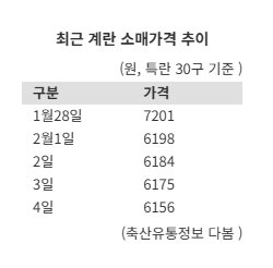 This is the first time egg prices have fallen back into the 6,000 won range in about a month, since December 25 last year, when they were 6,835 won. Prices are now even lower than a year earlier, when they were 6,590 won. Egg prices had peaked at 7,229 won on the 17th of last month.