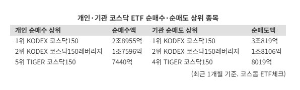 The most purchased product was the Samsung KODEX KOSDAQ 150 ETF, with net buying of 2.8955 trillion won. The KODEX KOSDAQ 150 Leverage ETF ranked second with 1.7596 trillion won in net purchases, and the Mirae Asset TIGER KOSDAQ 150 ETF came in fifth with 744 billion won in net buying.