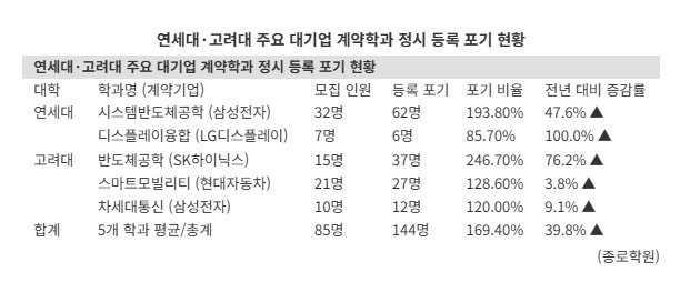 According to Jongno Academy on the 22nd, 144 students declined their regular-admission offers for the 2026 academic year across five corporate-sponsored departments at Yonsei University and Korea University, up from 103 the year before. Compared with the combined intake quota of 85 students at the two universities, the withdrawal rate reached 169.4%, higher than the previous year’s 143.1%.