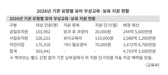 Per-child support rates by institution type will remain at the same level as in 2025, with differentiated amounts by category. For 101,902 children attending public kindergartens, 20,000 won per month will be provided for after-school programs, totaling 24.456 billion won. In private kindergartens, which enroll the largest number of children, 110,000 won per month in early childhood education fees will be provided for 226,221 children, with a total budget of 298.612 billion won. For 175,318 daycare users, 70,000 won per month will be offered as other necessary expenses, amounting to 147.267 billion won in total.
