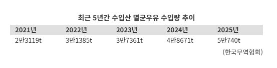 The domestic dairy and milk industries are taking a direct hit from the onslaught of imported sterilized milk. Import volumes of sterilized milk climbed from 23,119 tons in 2021 to 31,385 tons in 2022, 37,361 tons in 2023, 48,671 tons in 2024, and 50,740 tons last year, showing rapid annual growth. Meanwhile, deliveries of domestic milk for school meals and other uses have been steadily shrinking, partly due to the impact of low birth rates. Data from the Ministry of Agriculture, Food and Rural Affairs (MAFRA) and the Korea Dairy Committee show that per capita consumption of plain white milk peaked at 26.6 kilograms in 2021, then fell to 25.3 kilograms in 2024, continuing a downward trend.