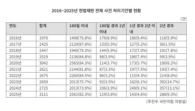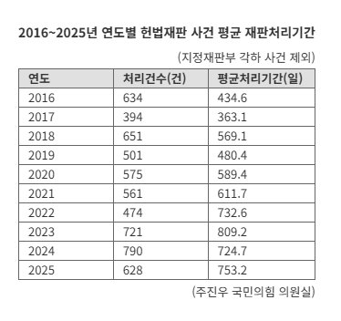 Data that Representative Ju Jin-woo of the People Power Party received from the Constitutional Court of Korea on the 4th show that, excluding cases dismissed by the three-judge preliminary review panels, the average processing time for 628 merits cases in 2025 is 753.2 days, or about two years and one month. This is roughly 30 days longer than the previous year’s average of 724.7 days.