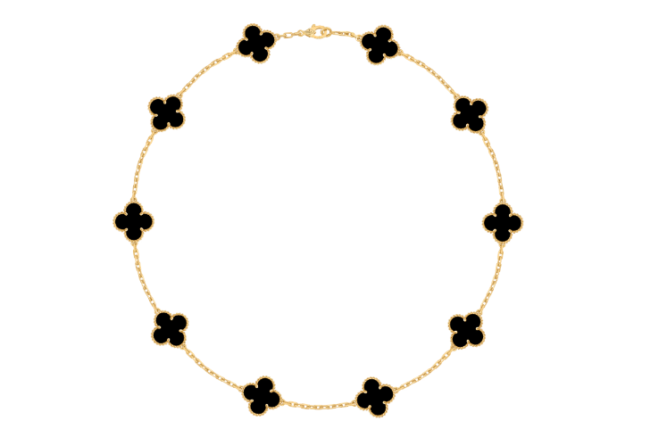 The model in question is a "10 Motifs" necklace featuring ten linked four-leaf clover designs in black onyx. It is currently listed at 15.5 million won on the official Van Cleef & Arpels website.
