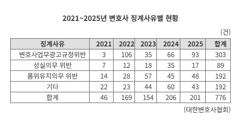 According to KBA data on disciplinary cases by cause, there were a total of 201 disciplinary actions against attorneys last year. This is similar to the previous year’s 206 cases, marking two consecutive years in the 200s. Before that, the highest annual number of disciplinary cases had been 169.