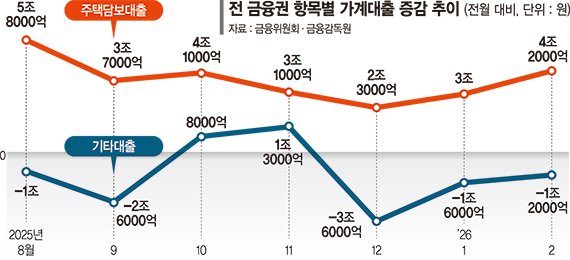 Household loans at non-bank financial institutions increased by 3.3 trillion won. Combined with the 2.5 trillion won rise in January, they have grown by 5.7 trillion won so far this year, already exceeding last year’s full-year net increase of 4.9 trillion won by 800 billion won. Mutual finance institutions saw their increase expand from 2.3 trillion won to 3.1 trillion won, while insurance companies shifted from a 200 billion won decline to a 200 billion won increase, and credit card and finance companies from a 10 billion won rise to a 100 billion won rise.