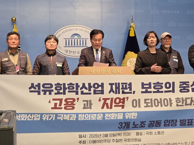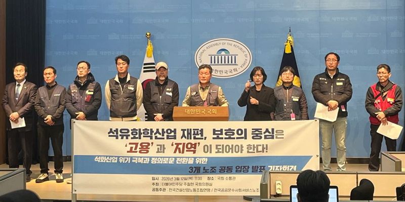 A press conference hosted by the office of Democratic Party of Korea lawmaker Joo Cheol-hyeon and co-organized by the National Construction Industry Trade Union Federation, the Korean Public Service and Transport Workers' Union, and the Korean Federation of Chemical, Textile and Food Industry Workers' Unions was held on the 12th at the National Assembly Communication Center. The unions announced a "Joint List of Demands by Three Industrial Unions for Overcoming the Petrochemical Industry Crisis and Ensuring a Just Transition."