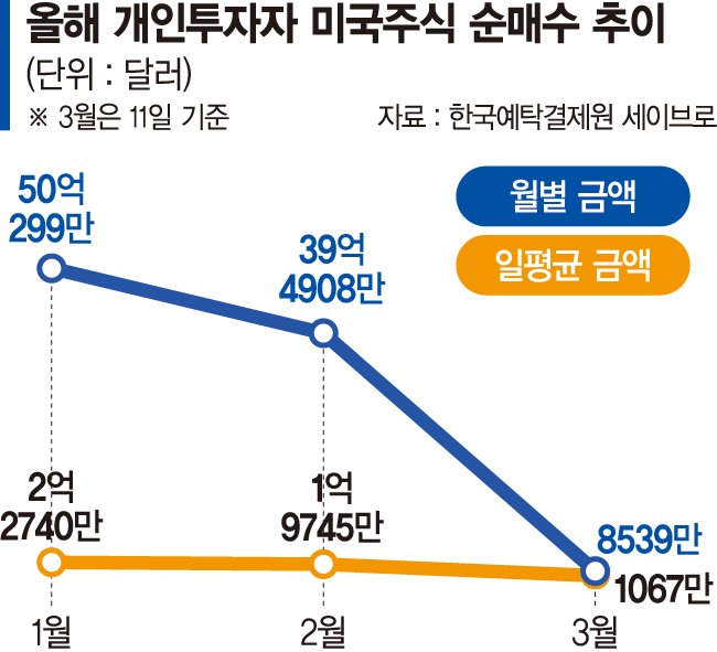 According to Korea Securities Depository (KSD) data from its Save-ro platform on the 12th, net purchases of U.S. stocks by domestic investors totaled 85.39 million dollars (about 124 billion won) between the 2nd and 11th of this month. Even allowing for the remaining days of the month, this is a steep drop compared with January and February, when net buying reached 5.00299 billion dollars (about 7.35 trillion won) and 3.94908 billion dollars (about 5.8 trillion won), respectively.