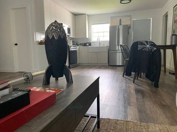 In the released photos, the interior has an open-plan layout where the living room and kitchen are connected without any separating walls. Only basic furnishings are visible, such as white cabinets, a stainless-steel refrigerator, a gas stove, and a sink. There are no notable paintings or decorations on the walls.