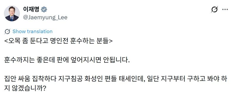 That day, President Lee wrote on X (social network, formerly Twitter), "So fixated on family feuds that you look ready to side with Martians invading Earth. Shouldn’t we save Earth first?"