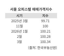 On March 15, data from the Korea Real Estate Board (KREB) showed that the Seoul officetel sale price index stood at 100.34 in March this year, up slightly from 99.71 a year earlier. The officetel sale price index is a relative indicator that sets December 2023 equal to 100. A reading above 100 means prices have risen compared with that point in time, while a reading below 100 indicates a decline.