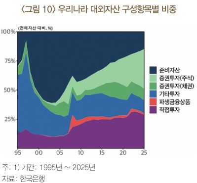 In fact, this composition of external assets is closer to that of advanced economies. Securities investments account for 38.7% of external assets in advanced economies, compared with 15.6% in emerging economies. Korea’s share is 5.4 percentage points higher than the advanced-economy average. As of 2024, 67.7% of Korea’s overseas equity investment was in the US, about 2.3 times the advanced-economy average of 29.5%.